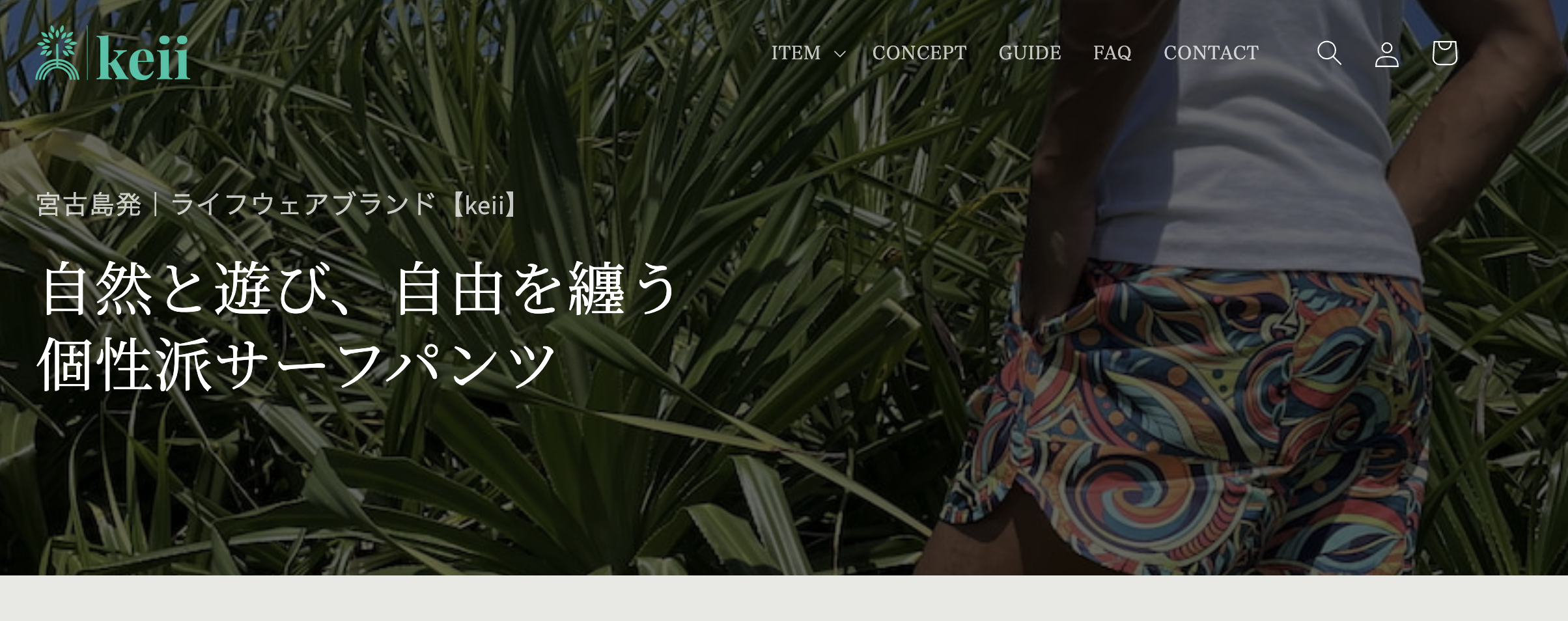 keii(キー)は、海やプールなどのレジャーシーンをはじめ、夏のアクティブな時間を快適に過ごすためのメンズ用サーフパンツを展開するブランドです。デザイン性と実用性のバランスを意識し、日常の延長として使いやすいアイテムづくりを大切にしています。