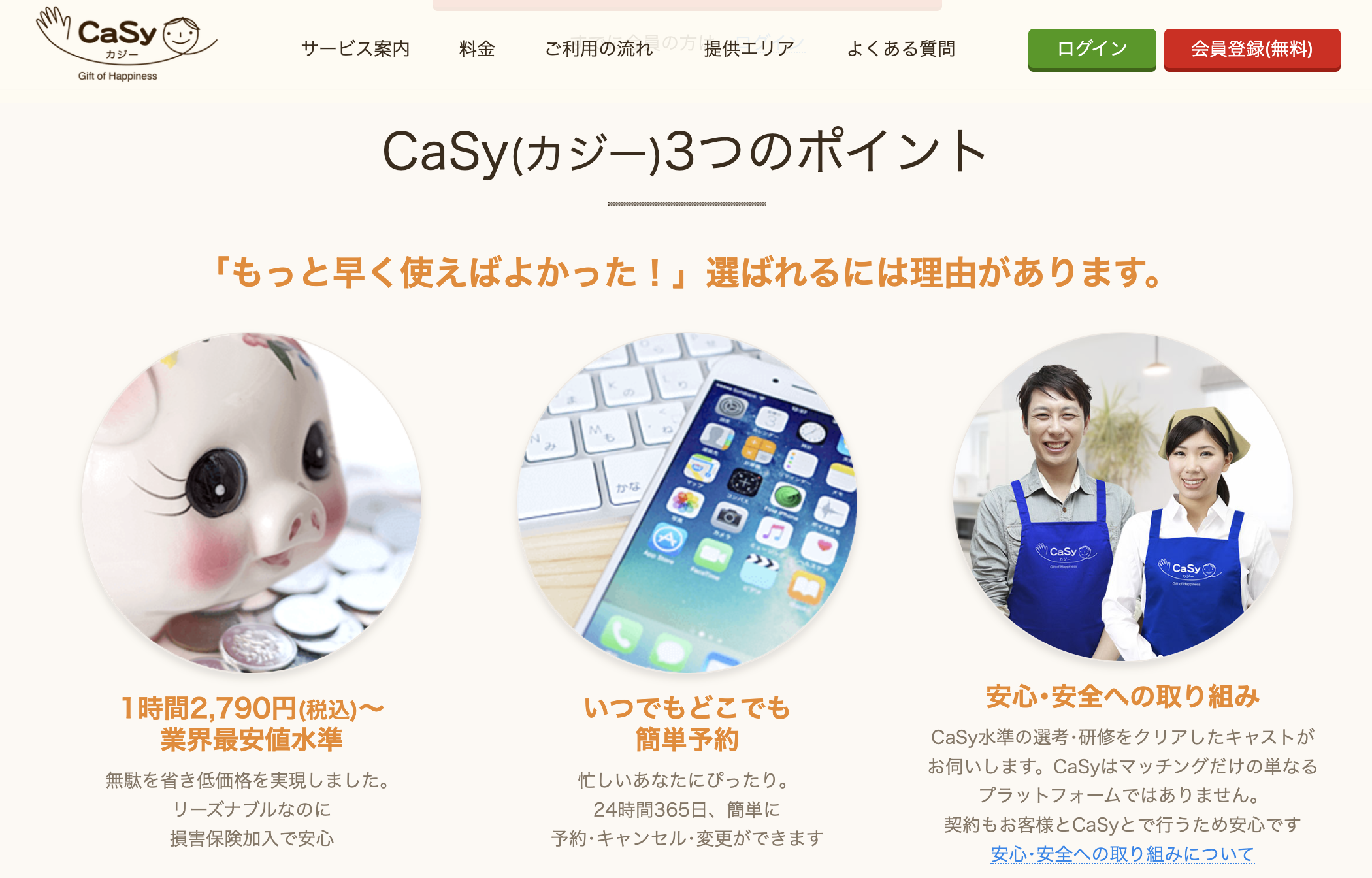 CaSy(カジー)は、掃除や料理などの家事をサポートする家事代行サービスです。オンラインから簡単に依頼できる仕組みが特徴で、忙しい日常の中でも家事の負担を軽減したい人に利用されています。