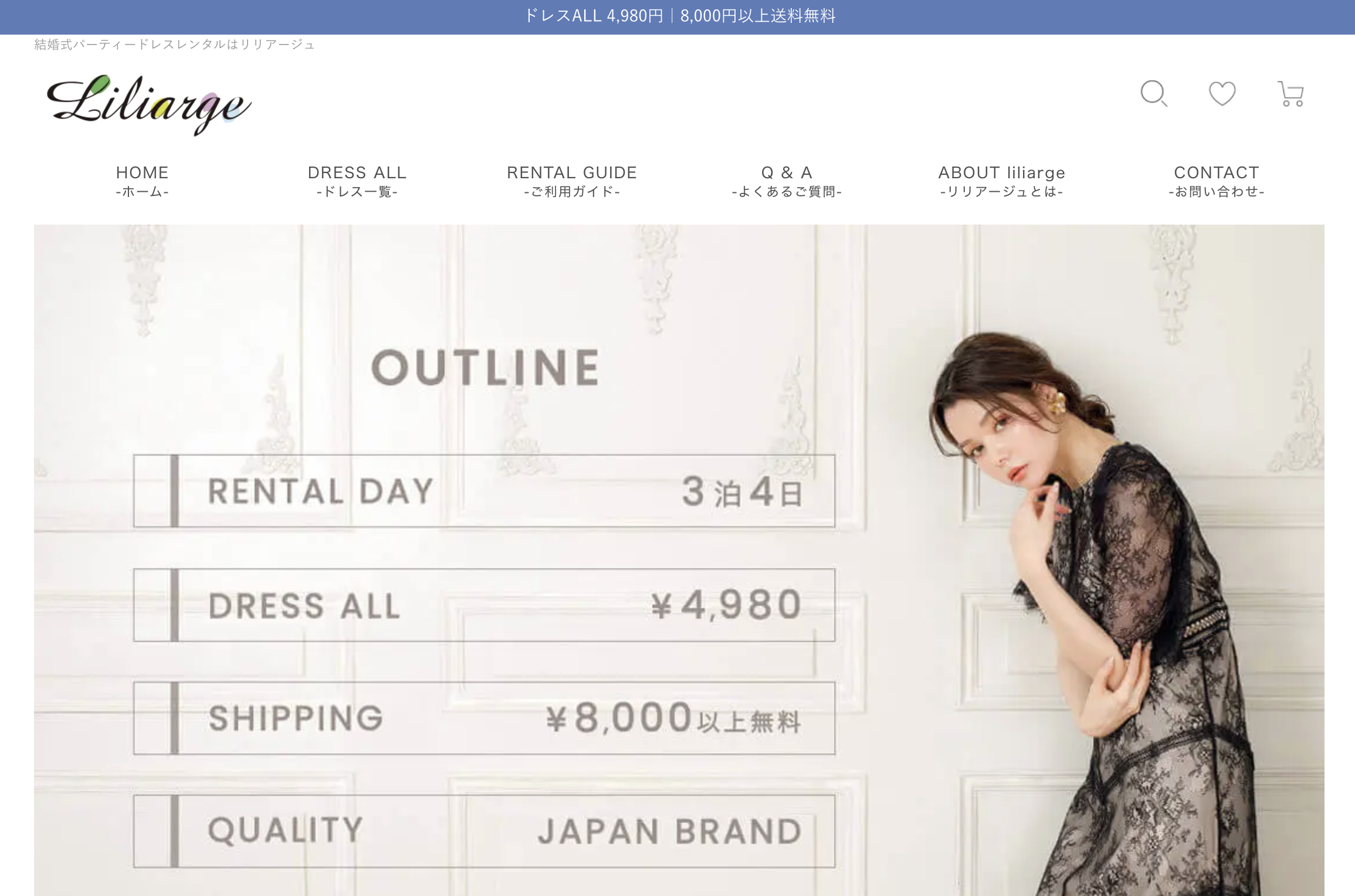 リリアージュは、業界最安級を目指した明確な価格設定と、国内メーカーにこだわった品質、シンプルで安心なレンタル日程が特長のドレスレンタルサービスです。